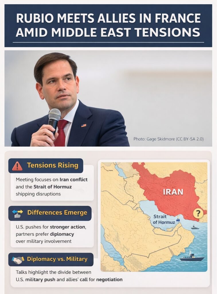 U.S. Senator Marco Rubio is meeting with top diplomats in France today as part of a high-level gathering focused on the escalating crisis in the Middle East. The talks come at a critical moment, as global leaders grapple with the consequences of regional instability, including disruptions to maritime trade and concerns over Iran’s military activities.